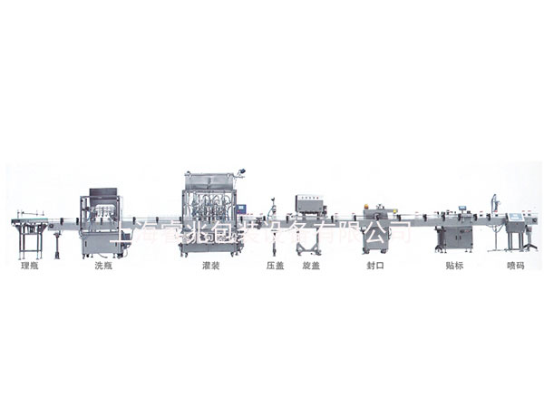 此生产线有理瓶机、全自动洗瓶机、全自动灌装机、压盖机、全自动旋盖机、全自动电磁感应铝泊封口机、全自动贴标机、喷码机组成。