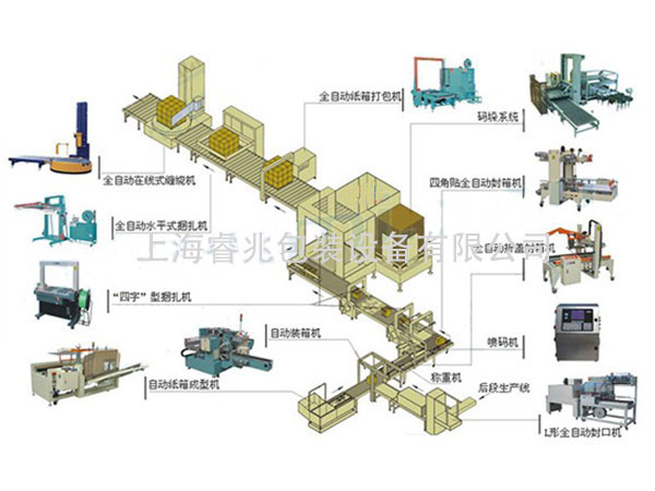 此后段包装流水线可完成自动开箱、产品自动整列、产品自动装箱、产品装箱检测、纸箱封箱设备、打包机、自动码垛系统、自动缠绕设备;设备的选型和功能可根据客户的要求来研发定制。